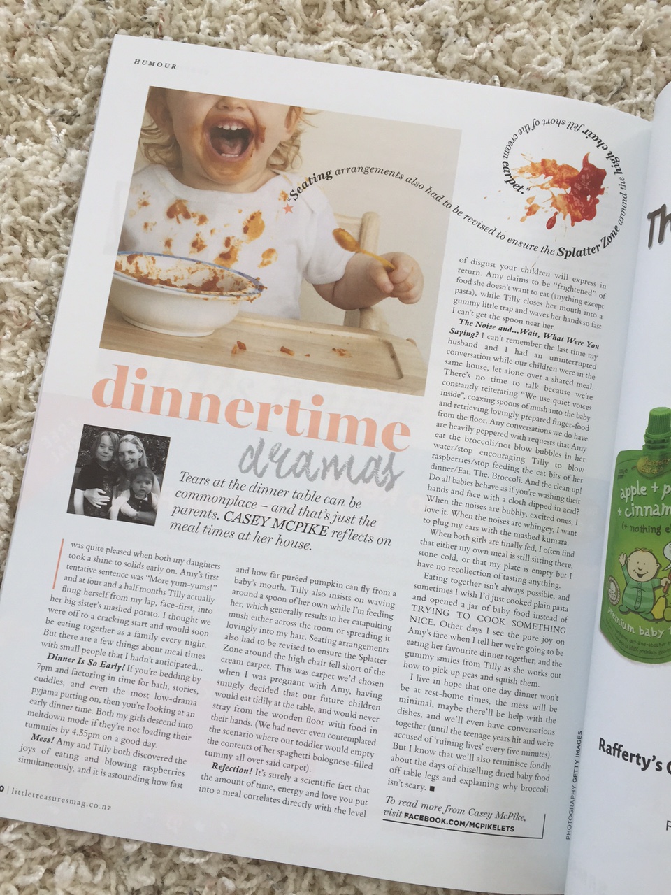 Mess! Amy and Tilly both discovered the joys of eating and blowing raspberries simultaneously. It’s astounding how fast and far pureed pumpkin can fly from a baby’s mouth. Tilly insists on waving around a spoon of her own when I’m feeding her, which generally results in her catapulting mush across the room/into my hair. Seating arrangements had to be revised to ensure that the splatter zone around the high chair fell short of the cream carpet. Carpet we’d installed when I was pregnant with Amy, having smugly decided that our future children would tidily eat at the table, and would never stray from the wooden floor with food in their hand (we foolishly never even imagined the scenario where our toddler emptied the contents of her Spaghetti Bolognese-filled tummy all over the carpet).