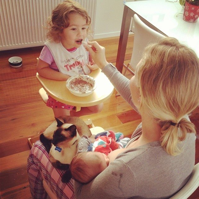Early-morning multitasking. This is JUST like the multitasking photo that supermodel Giselle posted. Except that she where she was multitasking breast feeding with having her hair, makeup and nails done for her in preparation for a modelling shoot, I’m multitasking breastfeeding with coaxing Weetbix into a reluctant toddler and managing the emotional needs of a displaced Siamese in preparation for a heady day of hitting the playground and supermarket. Also I’m pretty sure Giselle didn’t have sick on her shoulder in her photo. Other than that, this is JUST the same.