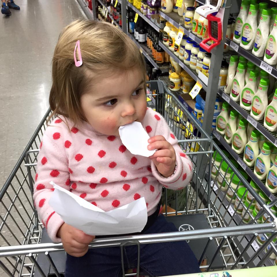 With child #1, I would have worried that fellow shoppers were judging me for letting my child possibly ingest paper; but she’s the second child, so I enjoy the quiet and count it as her afternoon tea.