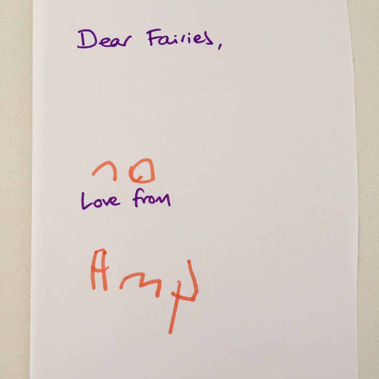 Noticing how eager Amy was to jump at the fairies’ requests for drawing pictures of rainbows/her family/butterflies etc, I thought I’d branch out and get these fairies into educating my preschooler. Amy is generally hesitant to get excited about my gentle coercion to practice writing (because work), and she completely got the shits with me the other day for subtly suggesting we could try to get her “Y” looking more like an actual Y, and less like a demented pitchfork. I was sure the fairies would get a much better reception for handwriting requests as she probably wouldn’t realise it was a work thing, because FAIRIES ARE WAY MORE FUN THAN MUMS ARE.